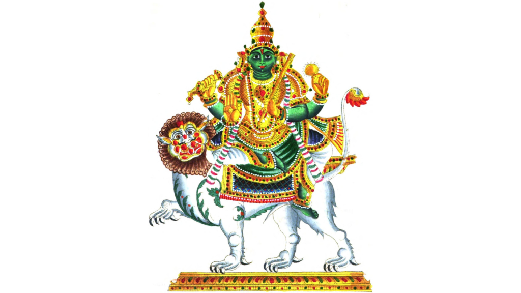 緑色の象徴: ブダの肌は緑色に描かれます。これは水星の色であり、植物の生命力、知性の新鮮さ、成長と適応を表します。