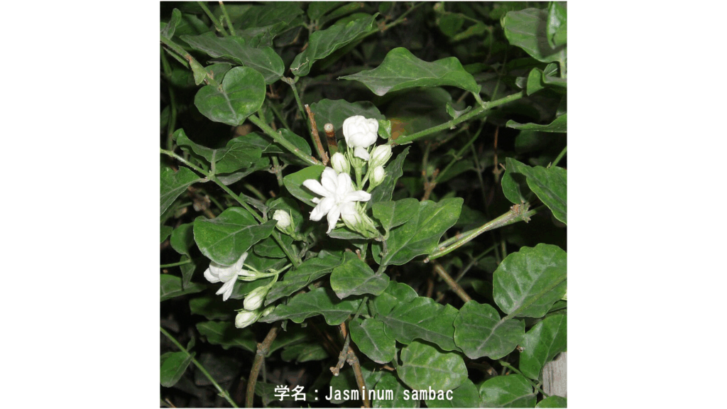 - 学名:Jasminum sambac(アラビアジャスミン)、Jasminum grandiflorum(スパニッシュジャスミン)