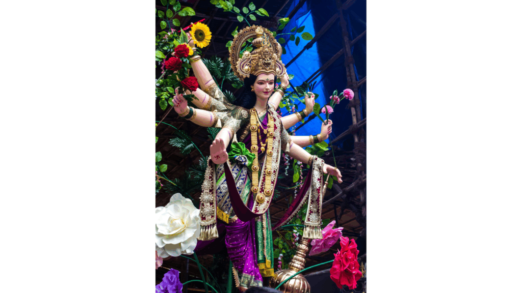 ナヴァラートリの夜、赤い花で飾られたドゥルガー像を見るとき——そこには、正義のために戦う勇気、愛するものを守る決意、そして必ず訪れる勝利への確信が宿っています。