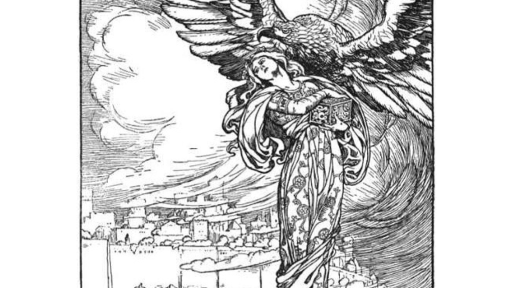 突然、巨大な鷲が急降下してきて、イドゥンを鷲の爪で掴み、空へ飛び去りました。