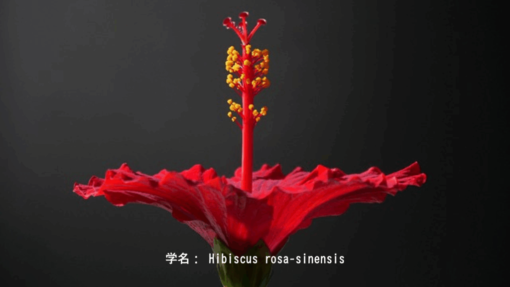 Hibiscus rosa-sinensis(チャイニーズハイビスカス): 最も一般的な観賞用ハイビスカス。大輪で鮮やかな赤。