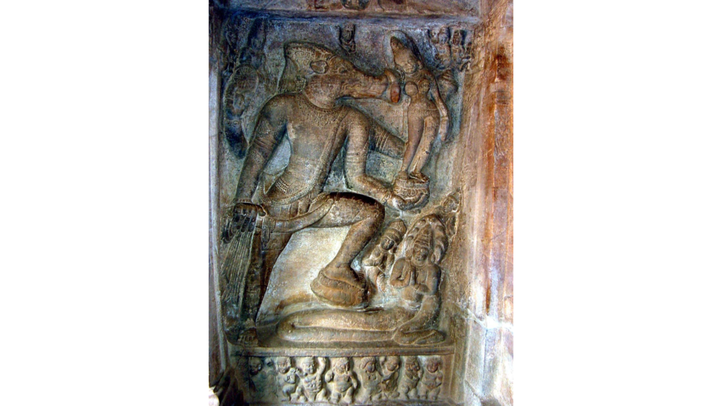 太古の時代、大地は海底に沈められていました。女神ブーミは苦しみの中で助けを求めました。ヴィシュヌ神はヴァラーハ(猪)の姿となり、海底へ潜りました。