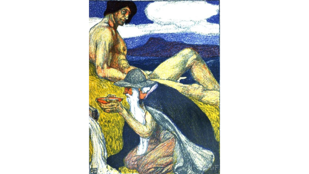その樹の下で、北欧の最高神オーディンが座っています。彼には片目がありません。知恵と引き換えに差し出したその目は、泉に沈んでいます。さらに樹に九日九夜吊るされ、ルーン文字の秘密を得ました。