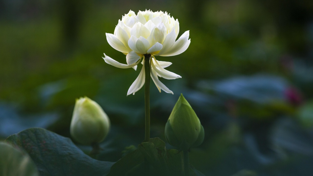 白い蓮が水面に浮かぶとき、その純白は周囲のすべてを映し出します——